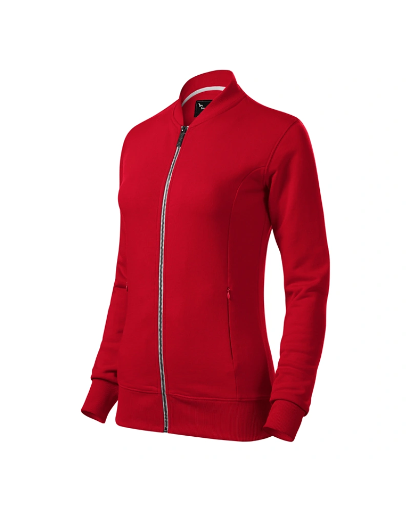 Dámská mikina s límcem v podobě stojáčku z žebrového úpletu. Celopropínací se stříbrným spirálovým zipem. Dvě přední kapsy ve stylu klokanky. Boční díly, spodní lem, manžety rukávů a lemy kapes z žebrového úpletu s přídavkem elastanu.