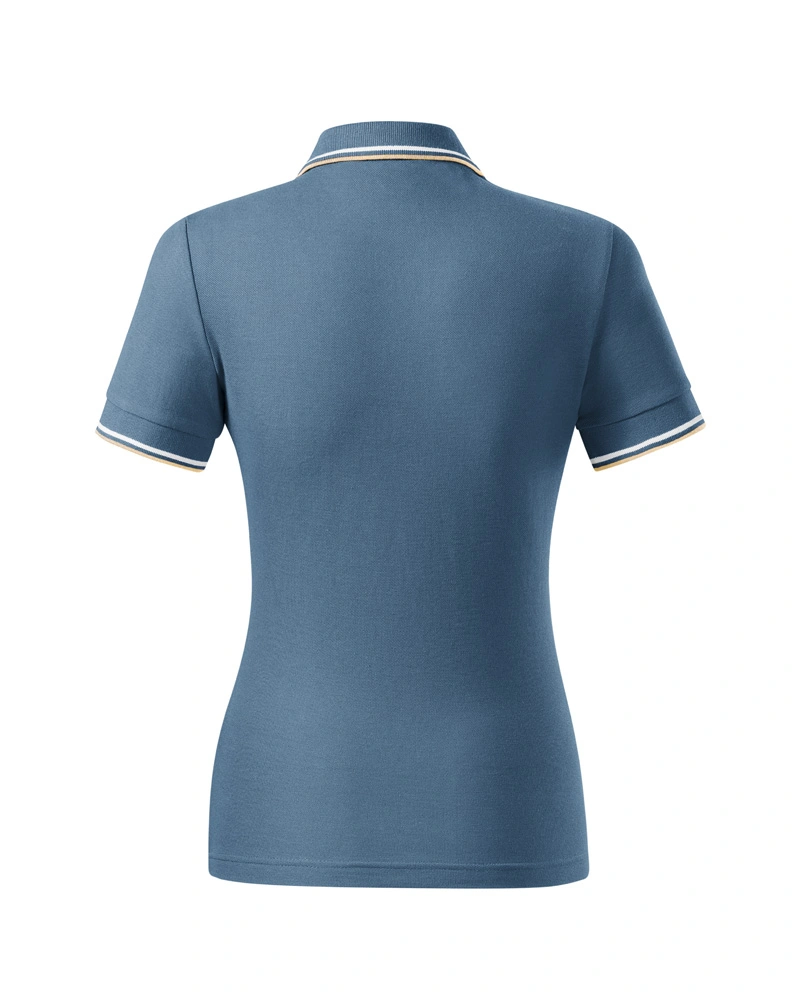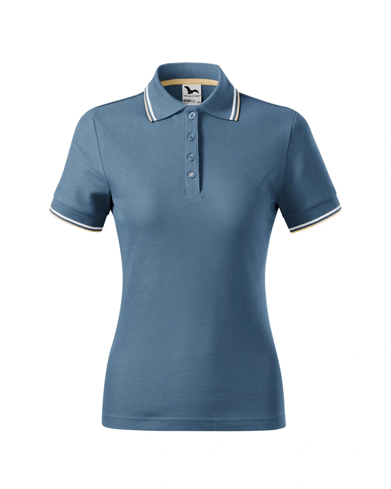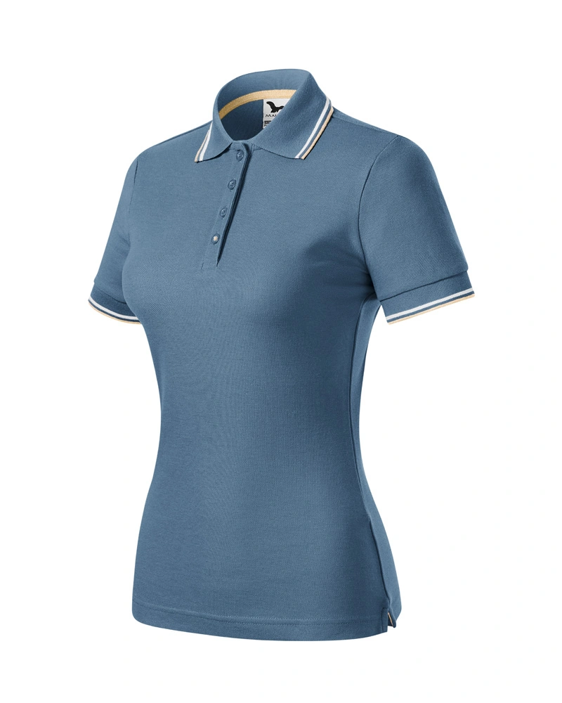 Dámská polokošile s dvojitým kontrastním proužkem na límci a manžetě. Límec a manžety na rukávech z žebrového úpletu. Střih s bočními švy, zpevněný ramenní šev.