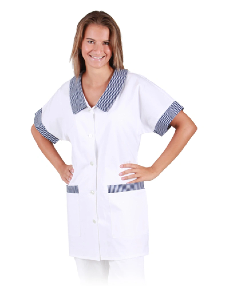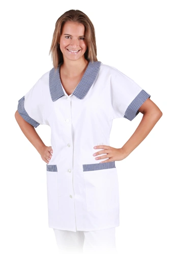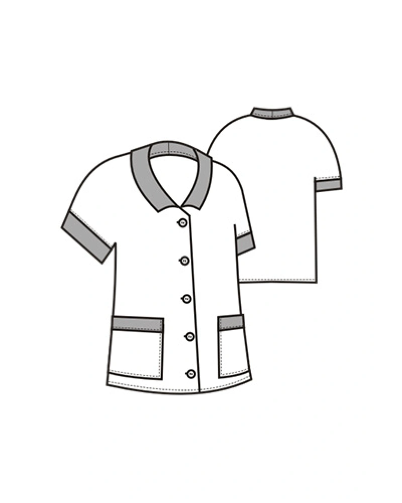 Propínácí halena s fazónkou, zapínání na knoflíky. Krátký rukáv. Přední díly se sedlem. Nakládané boční kapsy. Halena zdobená barevnou výpustkou.