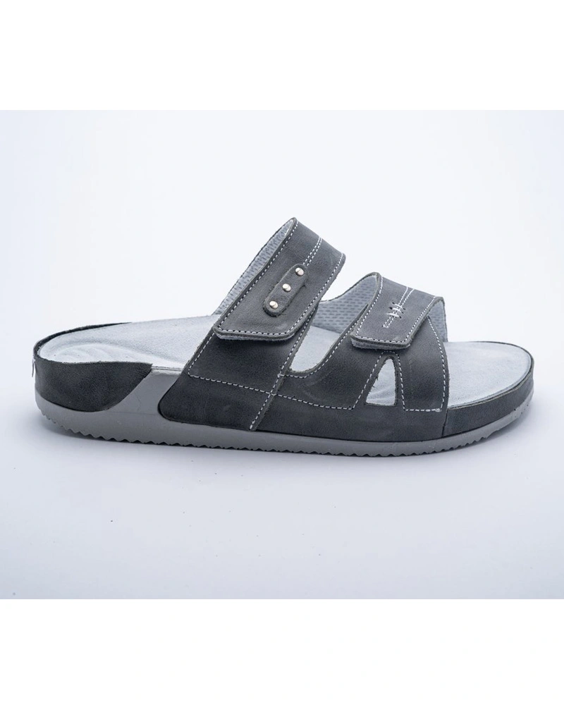 Unisexové korkové nazouváky se svrškem z materiálu action leather (štípaná kůže s povrchovou polyuretanovou úpravou). Nastavitelná šířka nártu pomocí dvou kovových spon.