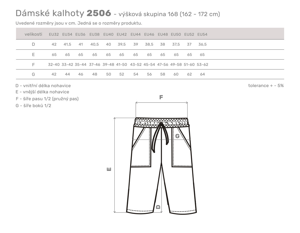 Dámské kalhoty v pase do pásku s gumou. Dvě boční kapsy. Délka kalhot pod kolena bez rozparku.Více informací