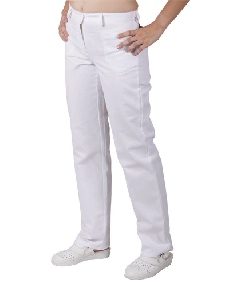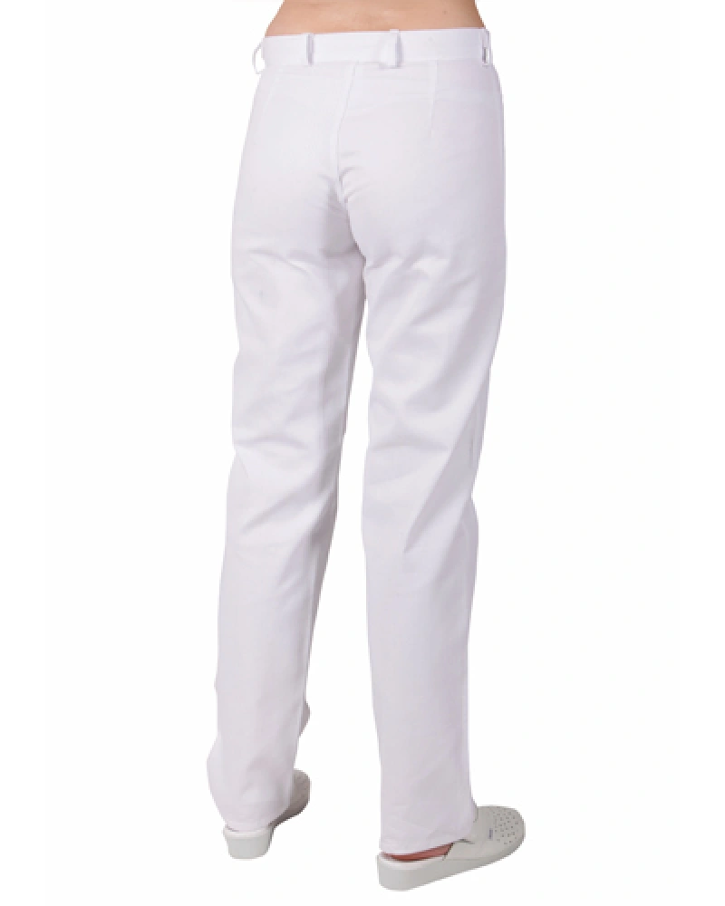 Dámské pracovní kalhoty s délkou pod kolena z elastického materiálu, snížený pas s patentem a tkanicí, falešný rozparek, boční kapsy váčkové, v bočních švech lampasy.