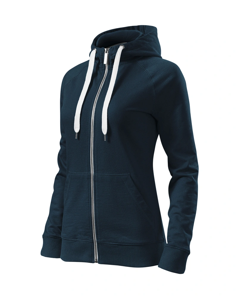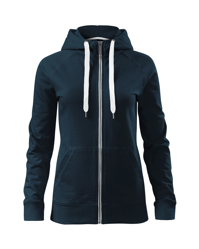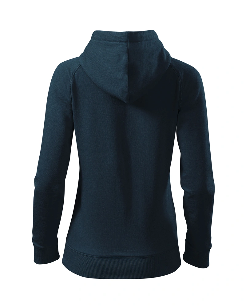 Dámská mikina s límcem v podobě stojáčku z žebrového úpletu. Celopropínací se stříbrným spirálovým zipem. Dvě přední kapsy ve stylu klokanky. Boční díly, spodní lem, manžety rukávů a lemy kapes z žebrového úpletu s přídavkem elastanu.
