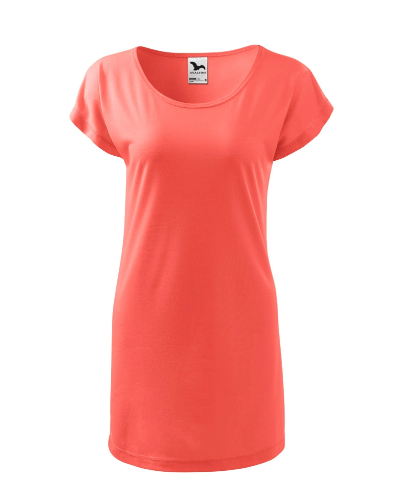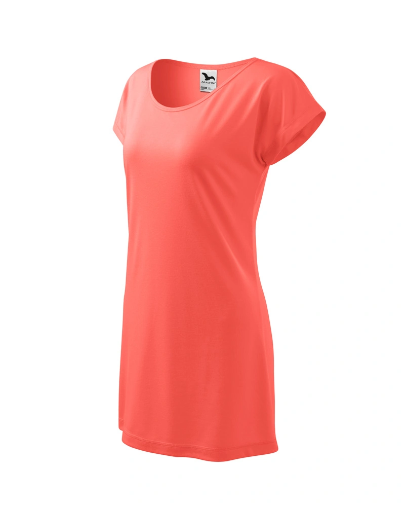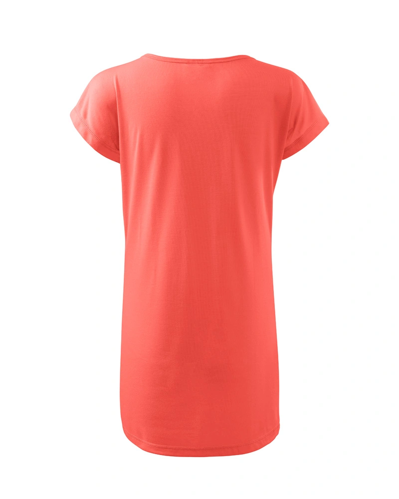 Dámské tričko volnějšího střihu s velmi krátkým rukávem. Kulatý průkrčník, ramena zpevněna všitým proužkem. Tričko sahá do hloubky boků.