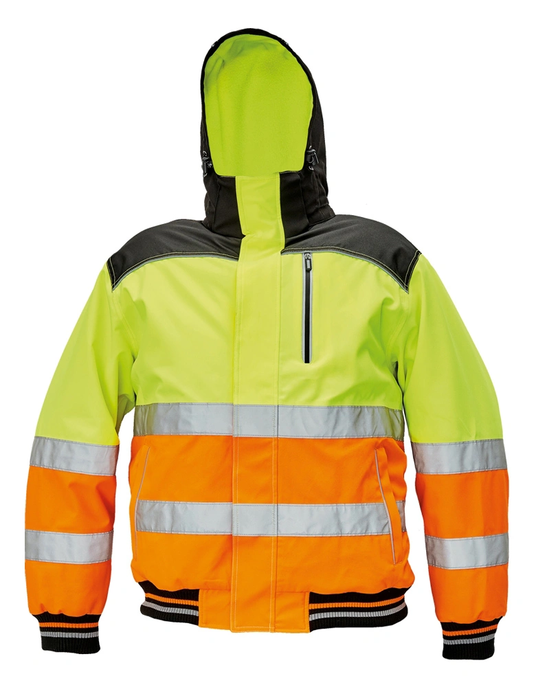 Pánská zateplená zimní bunda v hi-vis provedení s odnímatelnou kapucí. Zesílená část v oblasti ramen. Náprsní kapsa na zip v kontrastní barvě, 2 postranní lištové kapsy a 2 uzavíratelné vnitřní kapsy. Reflektivní paspulka lemující sedlo a boční kapsy. Dekorativní prošití.
