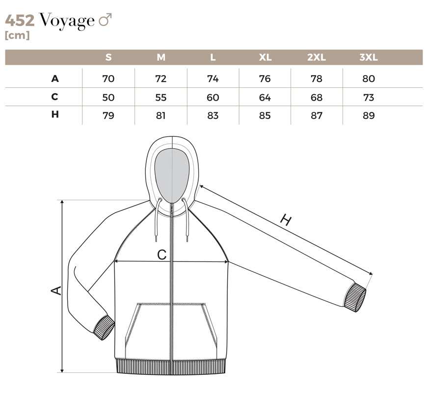 Pánská mikina s límcem z žebrového úpletu. Celopropínací na kovový zip. Dvě přední kapsy. Límec, boční díly, spodní lem, manžety rukávů a lemy kapes z žebrového úpletu.