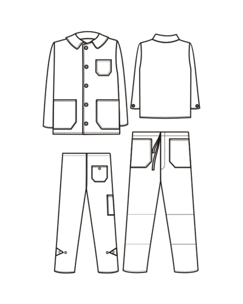Pánská montérková souprava, propínací blůza, kalhoty do pasu na šňůru, zdvojená kolena.Více informací