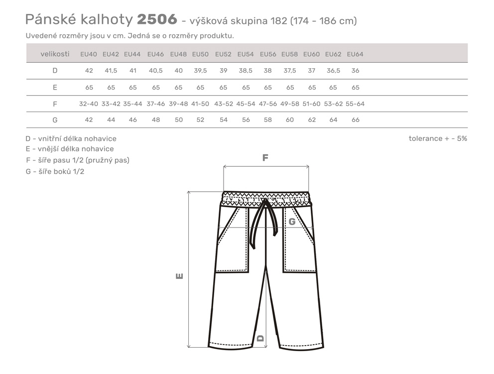 Pánské 3/4 kalhoty v pase do pásku s gumou. Dvě boční kapsy. Délka kalhot pod kolena bez rozparku.Více informací