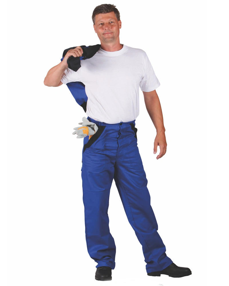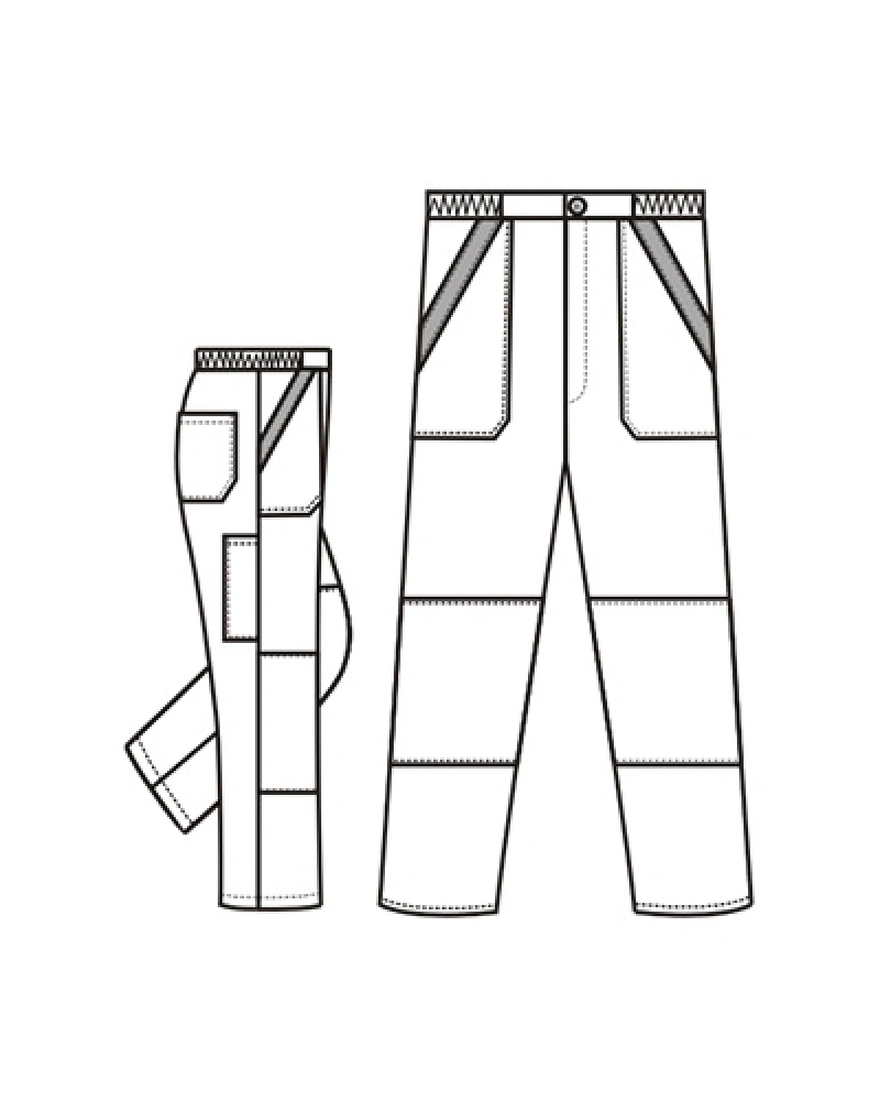 Pracovní unisex kalhoty s elastickým pasovým límcem a multifunkčními kapsami. Zvětšení švové záložky pro možnost individuálního prodloužení o max 6 cm. Reflexní prvky. Pásek není součástí balení. Velikosti 45, 47, 49, 51, 53, 55 jsou prodloužené délky.
