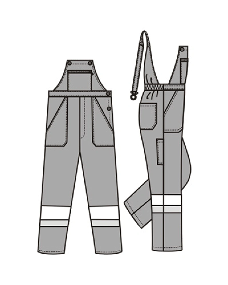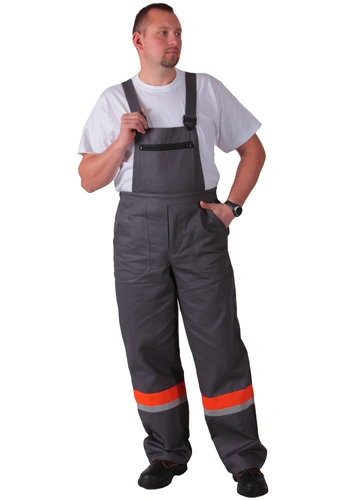 Kalhoty s náprsenkou, kapsa náprsenky na uzávěr. Šle s pruženkou, zapínání