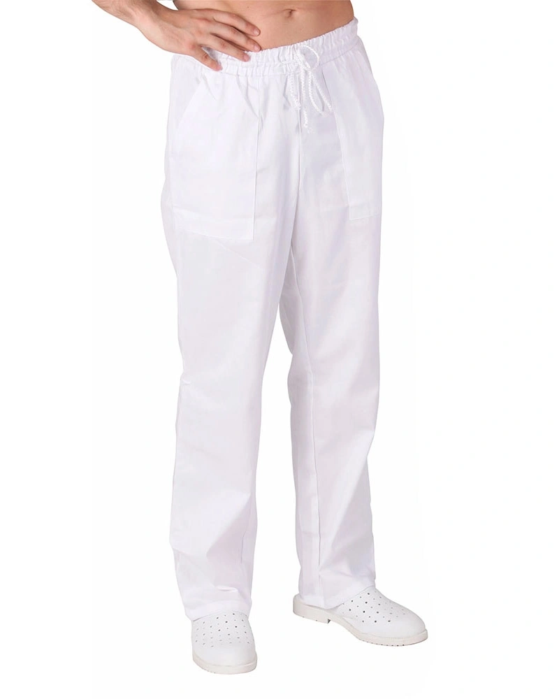 Dámské pracovní kalhoty z elastického materiálu se sníženým pasem, v pase je patent s tkanicí, falešný rozparek, boční kapsy váčkové, zadní kapsy nakládané.
