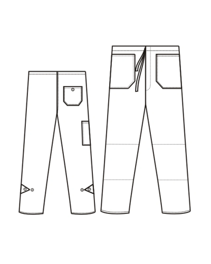 Pánské montérkové kalhoty do pasu, v pase na šňůrku, zesílená kolena, nohavice se zápinkou na knoflík, metrová kapsa.