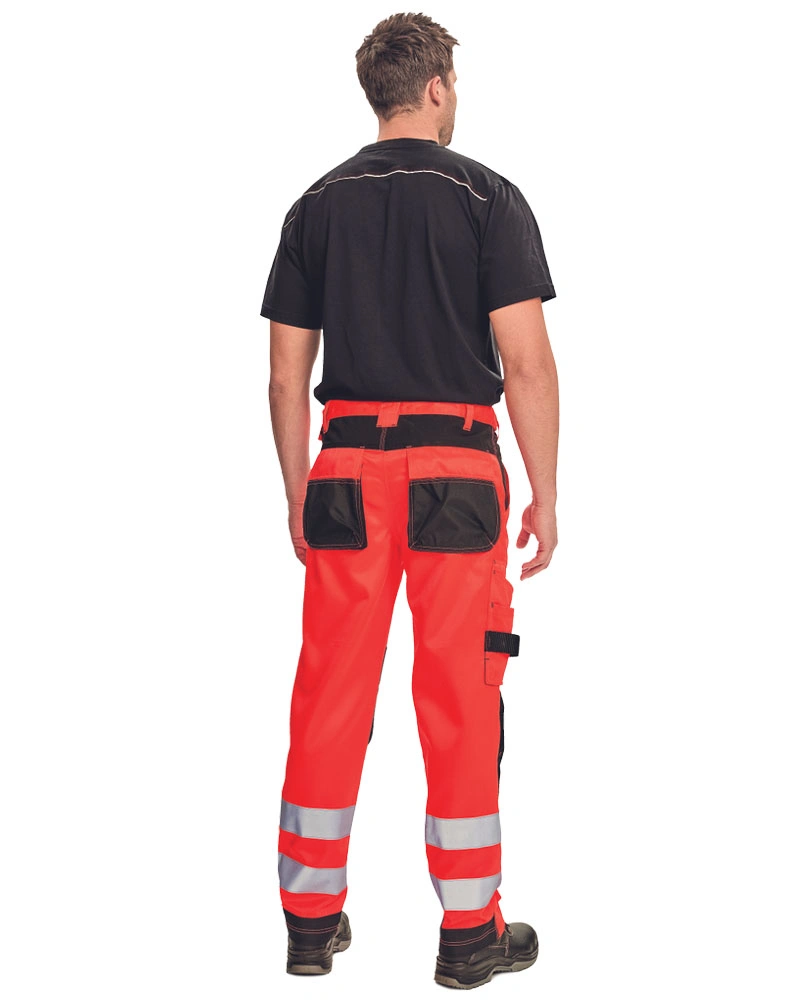 Reflexní unisexové pracovní kalhoty s vysokou viditelností. Retroreflexní pruhy a pruženka v zadní části pasového límce. Multifunkční kapsy.
