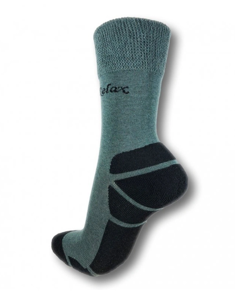 Ponožky RELAX vyrobené z tenké pleteniny, které mají velice jemnou a pružnou gumičku pro bezotlakové nošení po celý den. Dále v oblasti chodidla je ponožka tvořená froté úpletem.